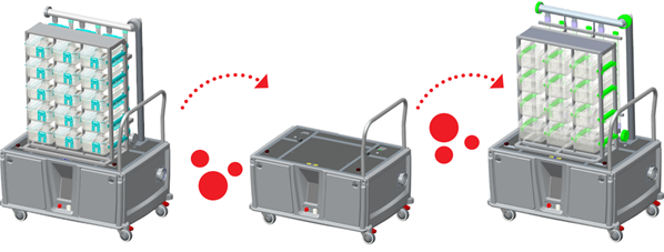 ■ Этот транспортировочный стеллаж обеспечивает контролируемую вентиляцию каждой клетки, когда они перемещаются между помещениями для содержания и экспериментальной зоной или при перемещении между разными подразделениями.