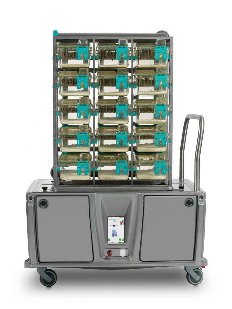 Устройство транспортировки ИВК было разработано для перемещения клеток из стеллажа для содержания/селекции в зону проведения экспериментов и/или для перемещения групп животных между устройствами. Оно также может быть использовано в качестве резервного устройства ИВК для небольшого количества животных, имеющих высокую ценность, или в качестве стеллажа для животных, ожидающих очередной процедуры при проведении эксперимента. Теперь вокруг больше нет невентилируемых клеток с ожидающими животными!