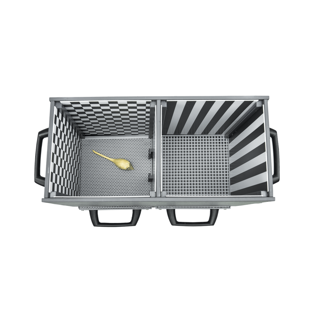 Бокс арт. 42552 разработан для тестирования крыс. Его наружные размеры составляют 60x30x30(в) см; бокс арт. 42553 рассчитан на мышей, его размеры (32x15x25(в) см). Оба бокса оснащены узорчатой дверцей в центральной стене, 7,5х7,5 см для крыс и 4х6(в) см для мышей.