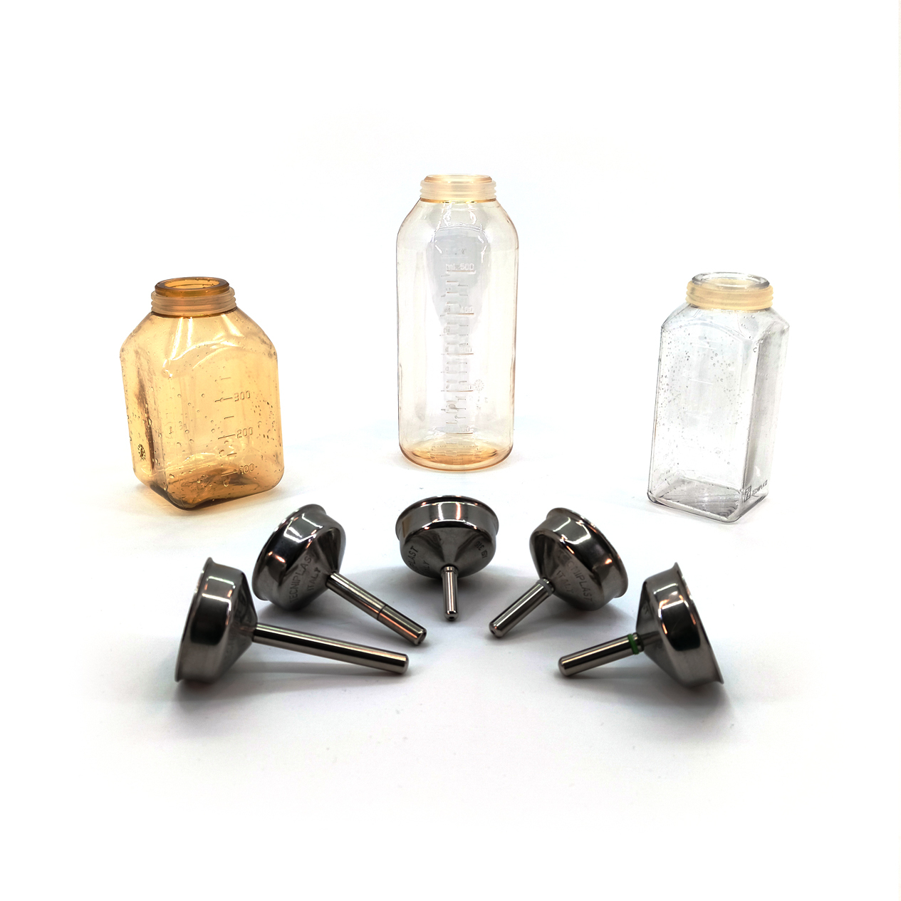 Бутылочки изготовлены из прозрачного поликарбоната, пригодного для стерилизации в автоклаве при температуре 121°C. Наиболее популярные размеры и модели дополнительно доступны в исполнении из более прочных и устойчивых материалов – полисульфона и полифенилсульфона.