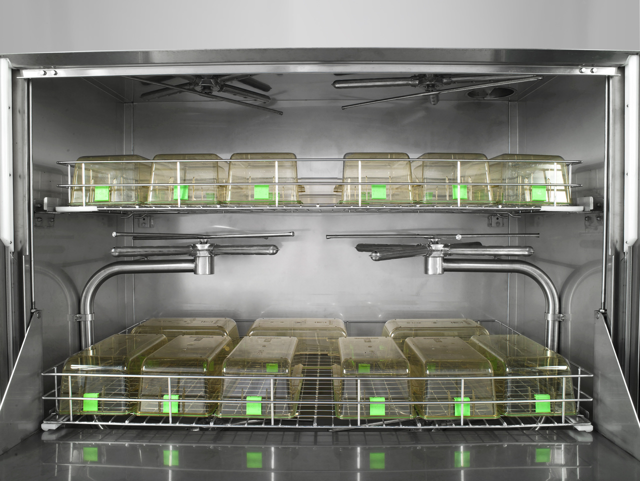 Технология мойки с полностью раздельными контурами мойки и ополаскивания осуществляется с помощью вращающихся коромысел-рычагов, расположенных в два уровня. Наличие более чем 70 форсунок из нержавеющей стали обеспечивает охват всей загруженной партии. Любые крупные частицы улавливаются каскадом горизонтальных сетчатых фильтров из нержавеющей стали перед сливом.