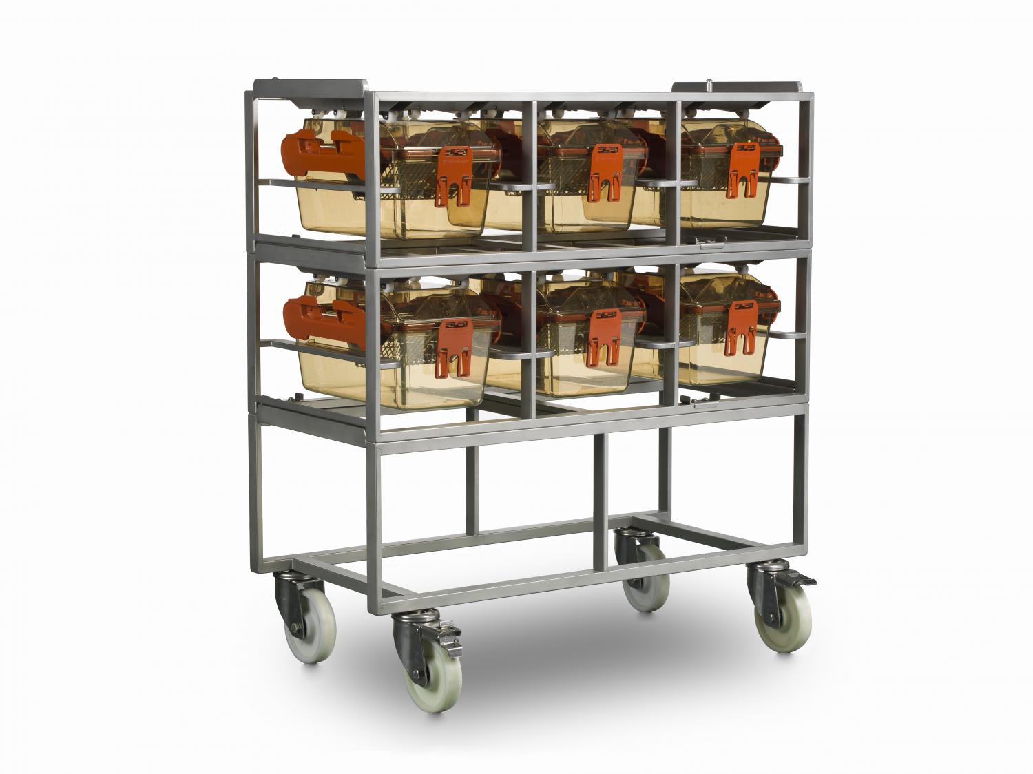 Автоклавируемый стеллаж ISO для дезинфекции изоляторов упрощает СОП и связанные с ними рабочие процессы, позволяя автоклавировать чистую клетку ISOcage с подстилом, едой и водой. Открытый клапан позволяет пару проникнуть и обеззаразить всю клетку. Прижимные ролики сохраняют крышки клеток в закрытом положении, препятствуя их повреждению в ходе обработки паром.