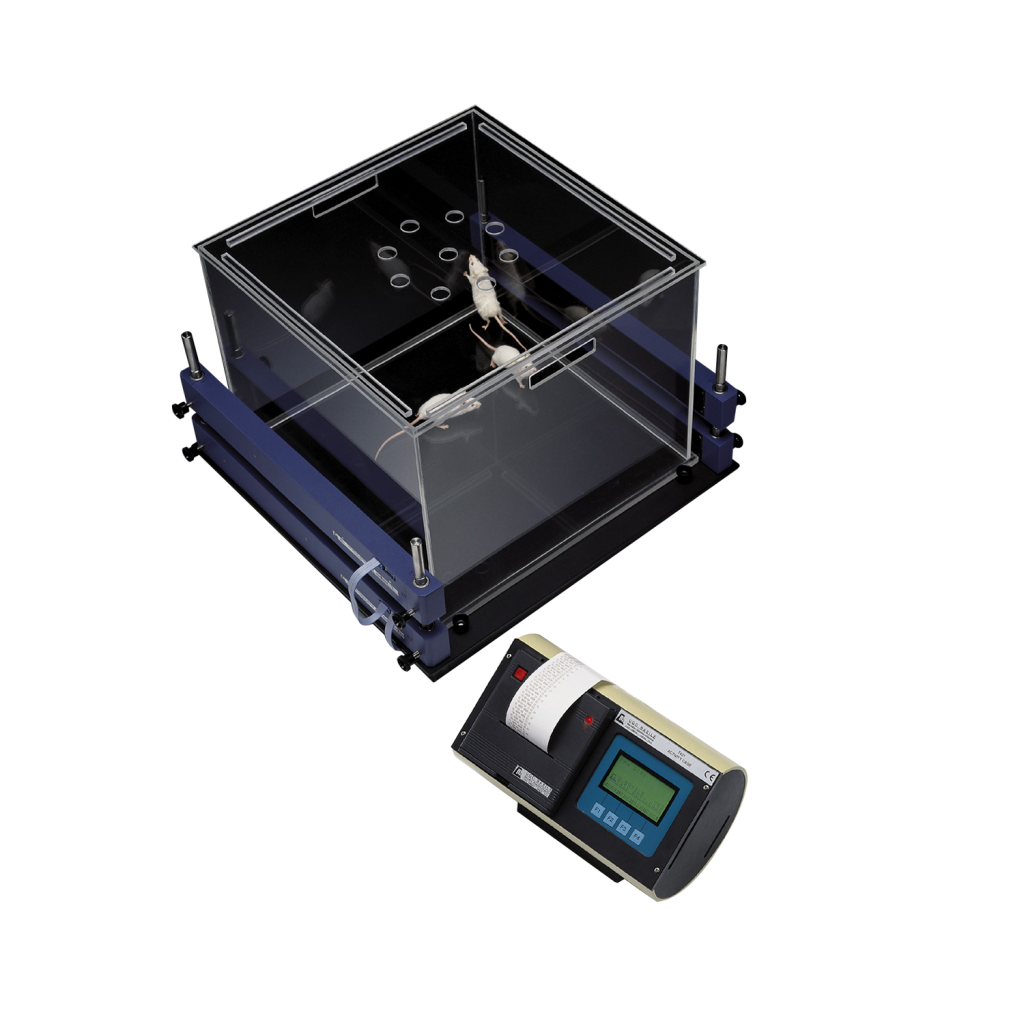 7435 состоит из двух наружных блоков, содержащих ИК-излучатели и, соответственно, датчики для записи горизонтальной активности. Аналогичная система, кат. 7436, с регулируемой высотой предназначена для оценки вертикальной активности (подъема на задние лапки).