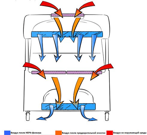 Модели ARIACS48 и ARIACS60 представляют собой бокс, формирующий защитный ламинарный поток. Подача осуществляется таким образом, чтобы нисходящая воздушная масса перемещалась вокруг сотрудника, выполняющего технологические манипуляции, для его защиты. Важно то, что воздух не попадает в рабочую зону, а направляется непосредственно в ламинарный бокс, что полностью блокирует риск контаминации продукта, находящегося в её пределах. Важной технической особенностью станции является и то, что нисходящий поток пропускается через НЕРА-фильтр и помогает обеспечивать защиту продукта. В результате удается свести до минимума возможность перекрестного заражения на рабочей поверхности станции. Отработанный воздух также проходит тщательную фильтрацию перед выбросом, исключая заражение окружающей среды.
