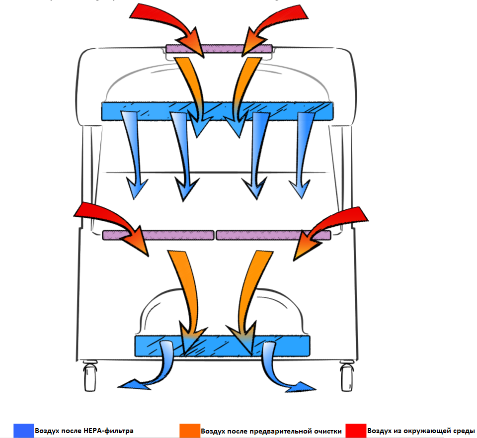 Воздушный поток перемещается вокруг оператора в ламинарный бокс, что обеспечивает защиту персонала. Кроме того, нисходящий ламинарный поток воздуха, отфильтрованного HEPA-фильтром, обеспечивает защиту продукта (класс ISO 4 в соответствии со стандартом ISO 14644-1), минимизируя вероятность перекрестной контаминации вдоль рабочей поверхности шкафа. Затем отработанный воздух пропускают через фильтр предварительной очистки и сертифицированный фильтр HEPA перед тем, как выбросить его в окружающую среду.