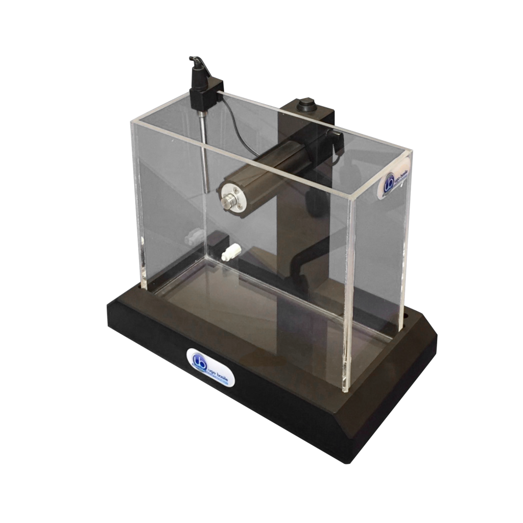 Устройство состоит из прозрачного резервуара для воды размером 20(ш)x8(г)x18(в) см. Водное колесо расположено в центре резервуара. Водное колесо имеет диаметр 3,5 см и ширину 8 см; шесть лопастей 0,5 см равномерно распределены по поверхности колеса.